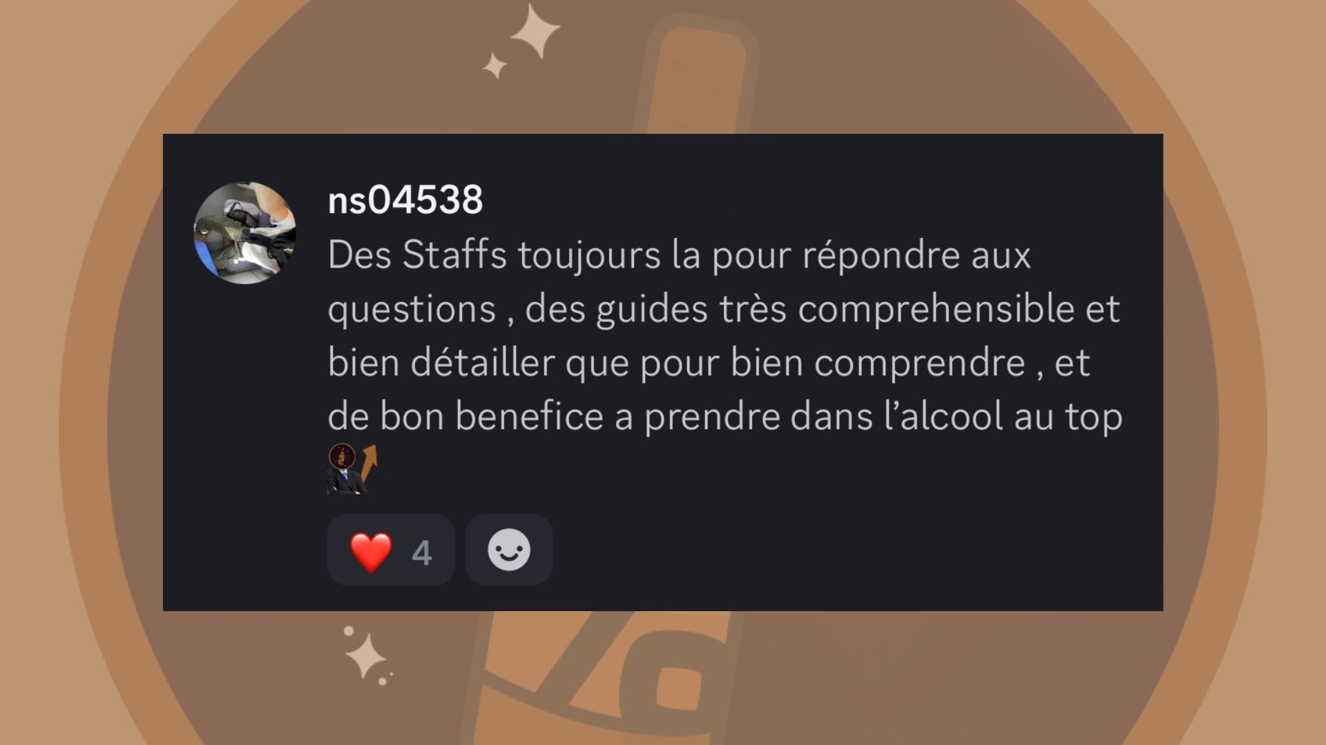Groupe très complet, que ce soit au niveau des guides, du staff, de l’entraide… rien à redire à part que si vous voulez gagnez de l’argent et que l’alcool vous intéresse, ce groupe est fait pour vous a 100%